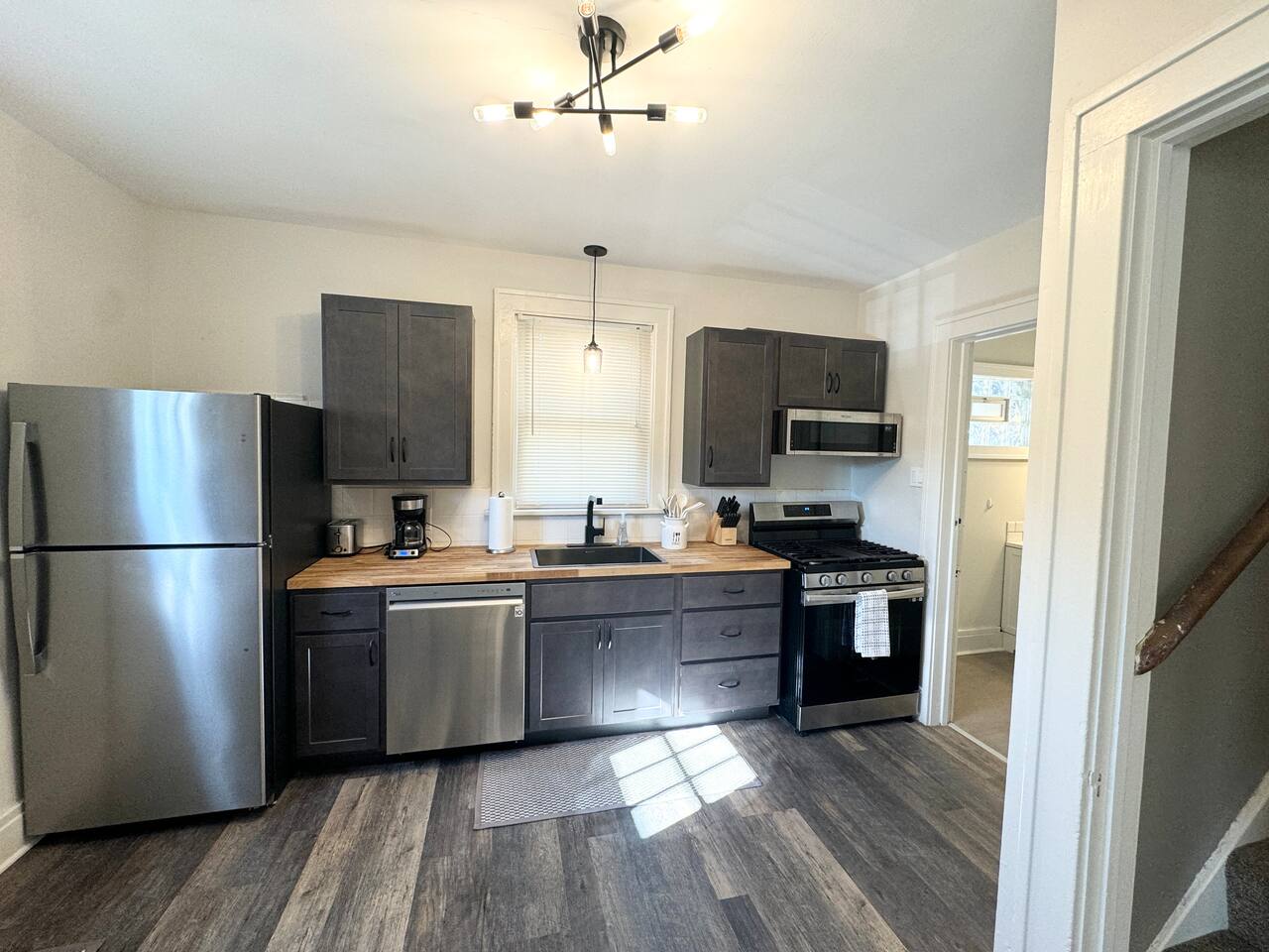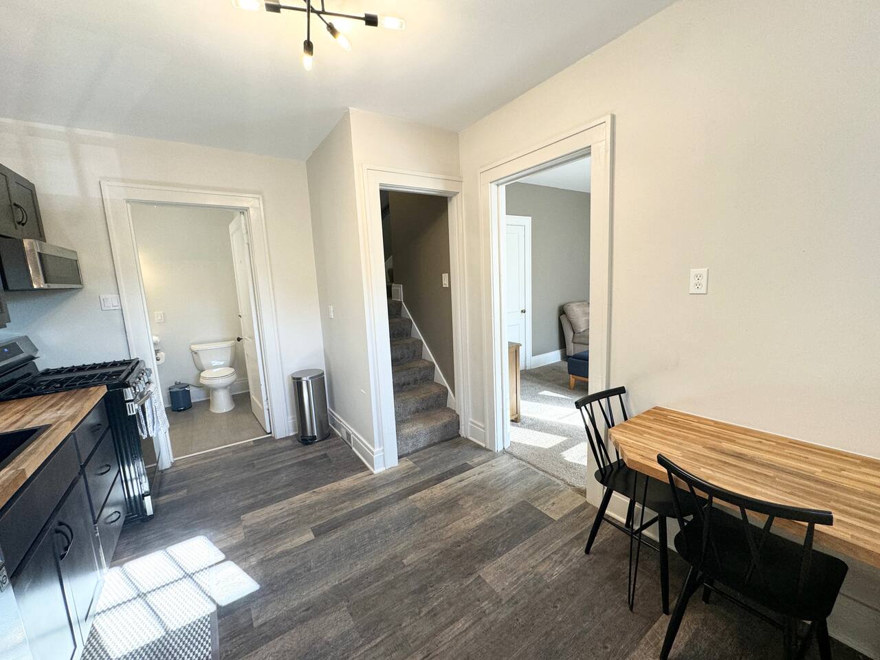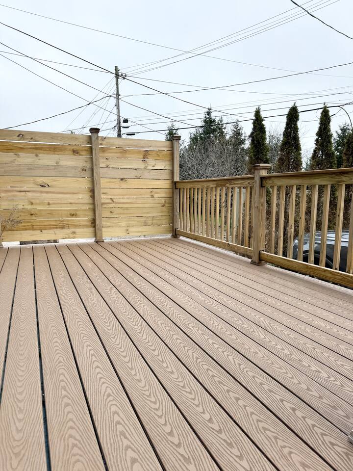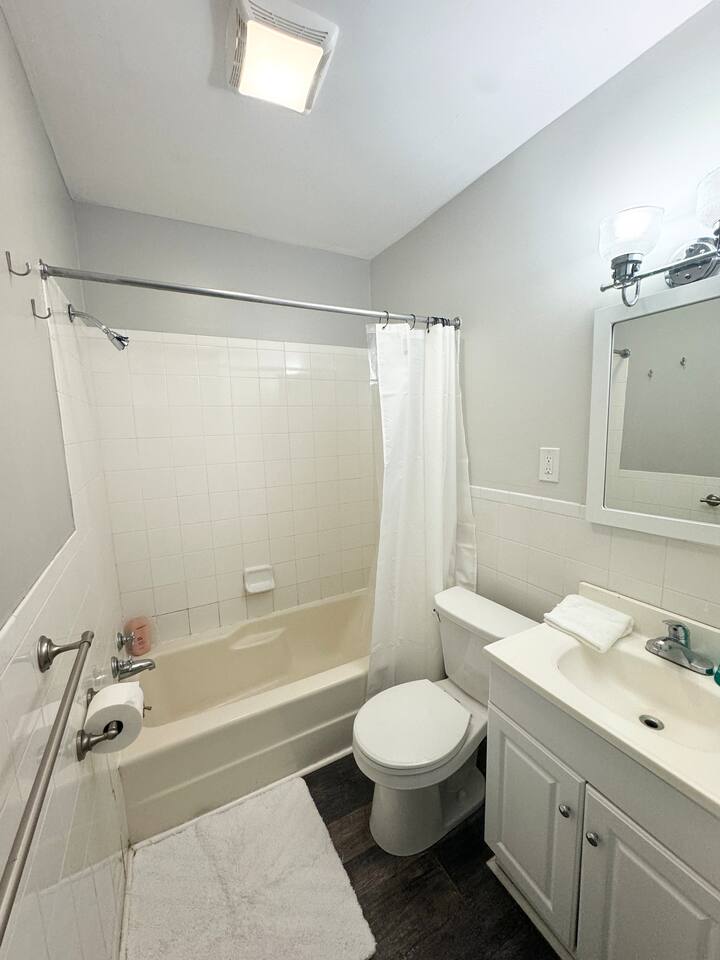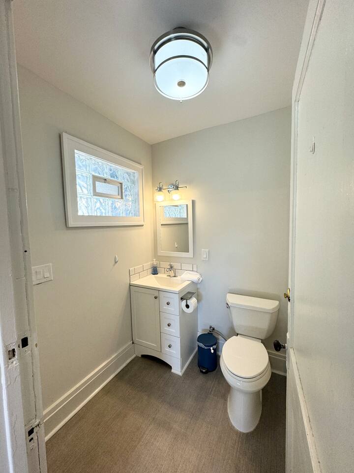 First floor consists of a recently renovated kitchen w/ built in table for two, a comfortable living room with a desk/chair.,55" smart TV and a 1/2 bath. Two bedrooms with extremely comfortable mattresses and Thuma frames along with a full bath on the second floor. Large furnished rear deck. Off street parking for one car. Courtesy laundry in basement.