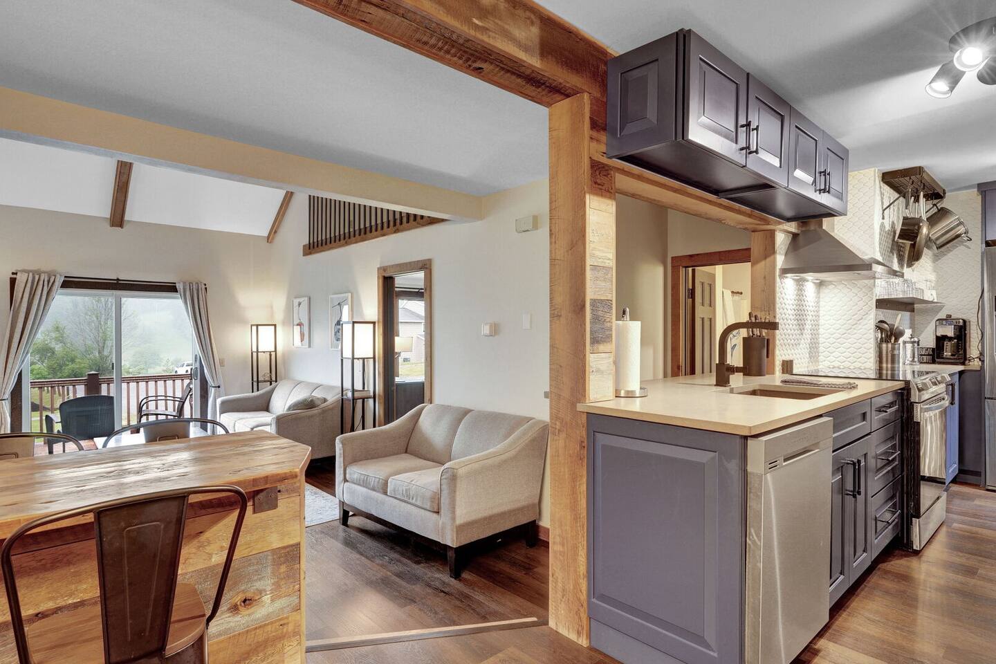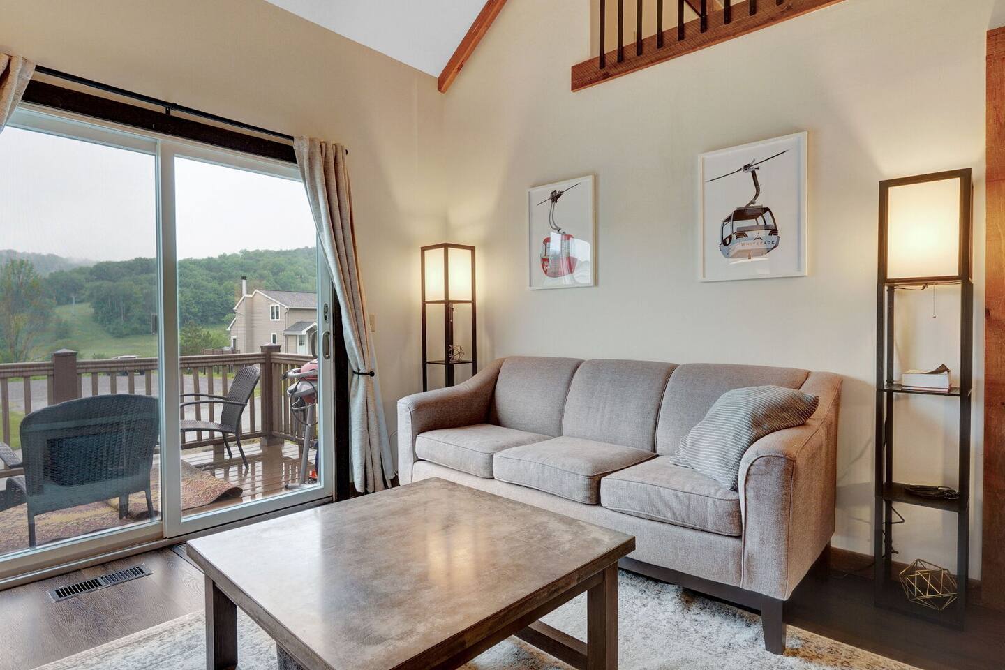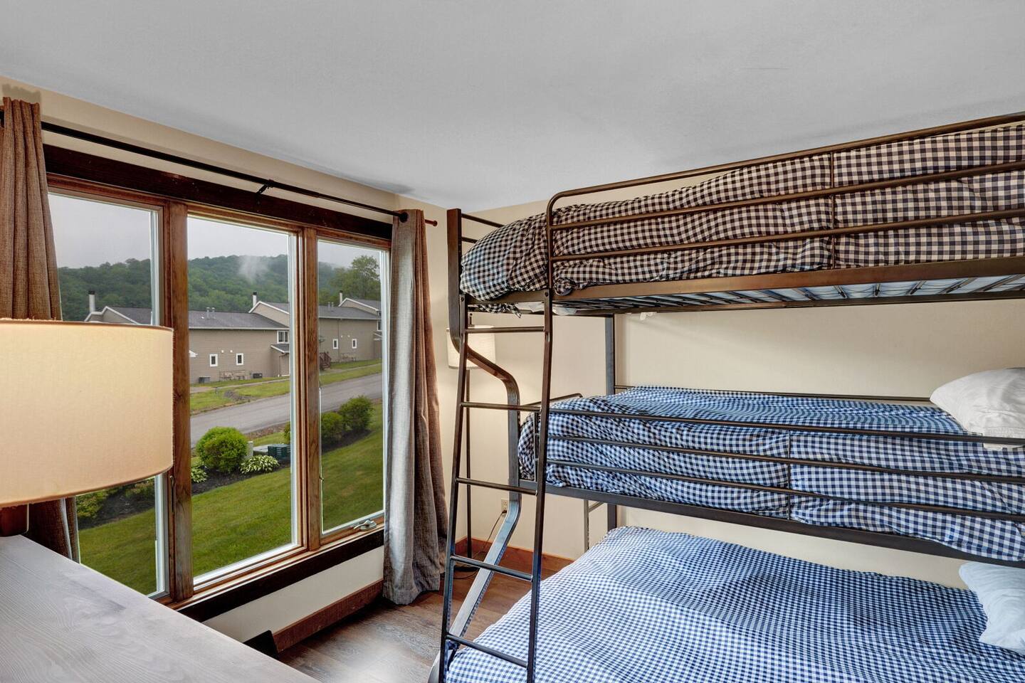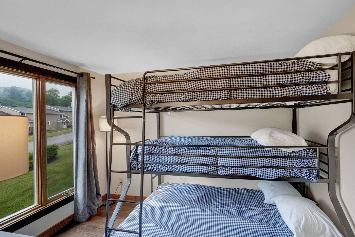 Renovated between 11/19-1/20 this home is one of the most modern units of the 64 at Fox Ridge. Currently there are two floors of updated space including a spacious living room with views of Holiday Valley that are only surpassed by those from the chair lifts! The galley kitchen is fully stocked with everything you need to cook meals for a crowd including a waffle maker for breakfast and a fondue set for apres ski. The wood treatment is from a local barn built circa 1840 and taken down by hand before being repurposed @ Valley View. The table top was custom made by a local craftsman and made of reclaimed White Oak along with the step to living room and loft. The loft railing was replaced with a support beam from the same barn. A variety of games, books and puzzles can be found in the media center and were curated to create engaging connections and create lifelong memories. When the day is done and everyone is exhausted the sleeping arrangements will be sure to please. The large master bedroom on the second floor enjoys plenty of soft natural light for a gentle morning wake up. You may not want to get out of the Thuma King Bed w/ Serta hybrid mattress and the softest sheets you’ve ever experienced. 42” smart TV recently installed! A large closet for extended stays and a handsome full bathroom is located in this room as well. A loft w/ a queen & armoire is located by walking through the master & overlooks living room. Don’t fret- the same Thuma/Serta combo is set up for a good nights rest here too. You’ll find a private bedroom off of the living room which has a triple bunk bed to sleep up to 5. The views from this bunk room are spectacular! The smart TV will have you binging on whatever your guilty pleasure is if the weather just isn’t cooperating. All the apps at your are fingertips including Disney+, Netflix, Showtime, Prime, HBO & Spectrum cable. But hey- get out and explore the Aspen of the East! Whether it’s a hike, a hamburger, a massage or a movie- our in house guide will ensure your experience in EVL is the best it can be! By the way, with a brand new high efficiency furnace and central air conditioning you'll be comfortable in a blizzard or a heat wave. The tank-less water heater will provide an endless supply of hot water so everybody can hit the shower then the town so fresh and so clean. Full basement with walk out doors and another beautiful view perfect for larger groups looking to have more space and more to do while inside. 55” smart TV and electronic dart board will provide hours of entertainment for adults and kids alike. The basement can sleep four with a full size memory foam sleeper sofa and full size Murphy Bed. There is a brand new full bathroom,Ski Locker with boot/glove dryer and large laundry room. Plenty of room to spread out in style and comfort around the electric fireplace.