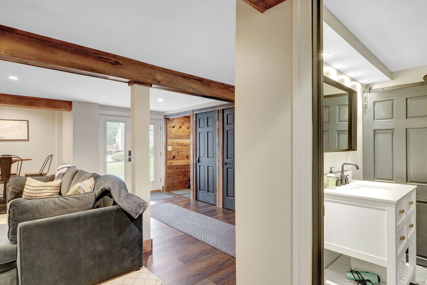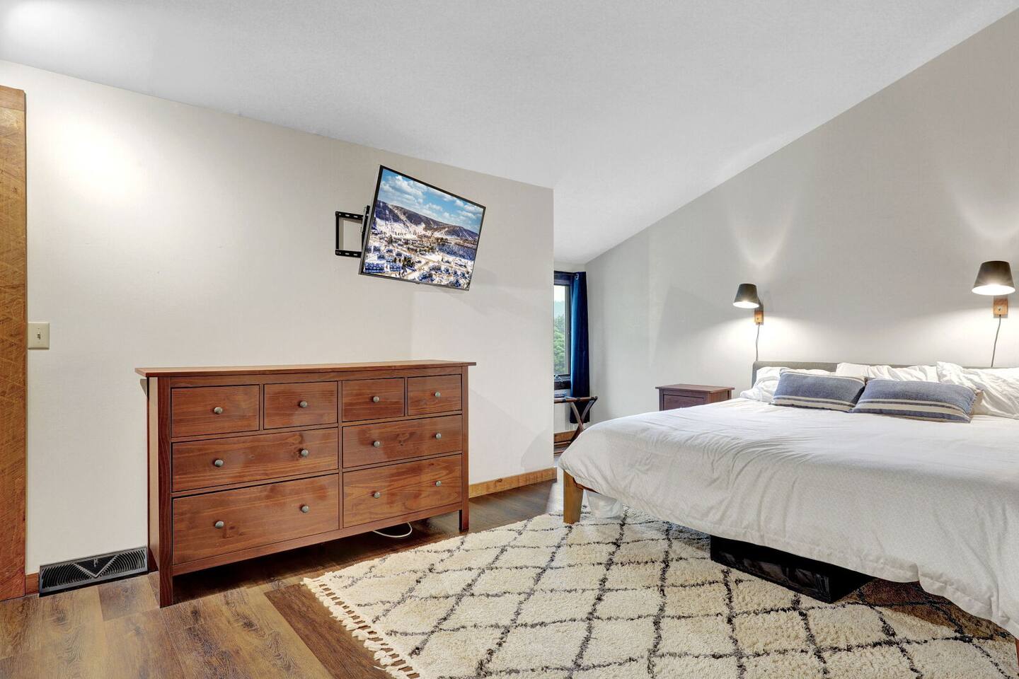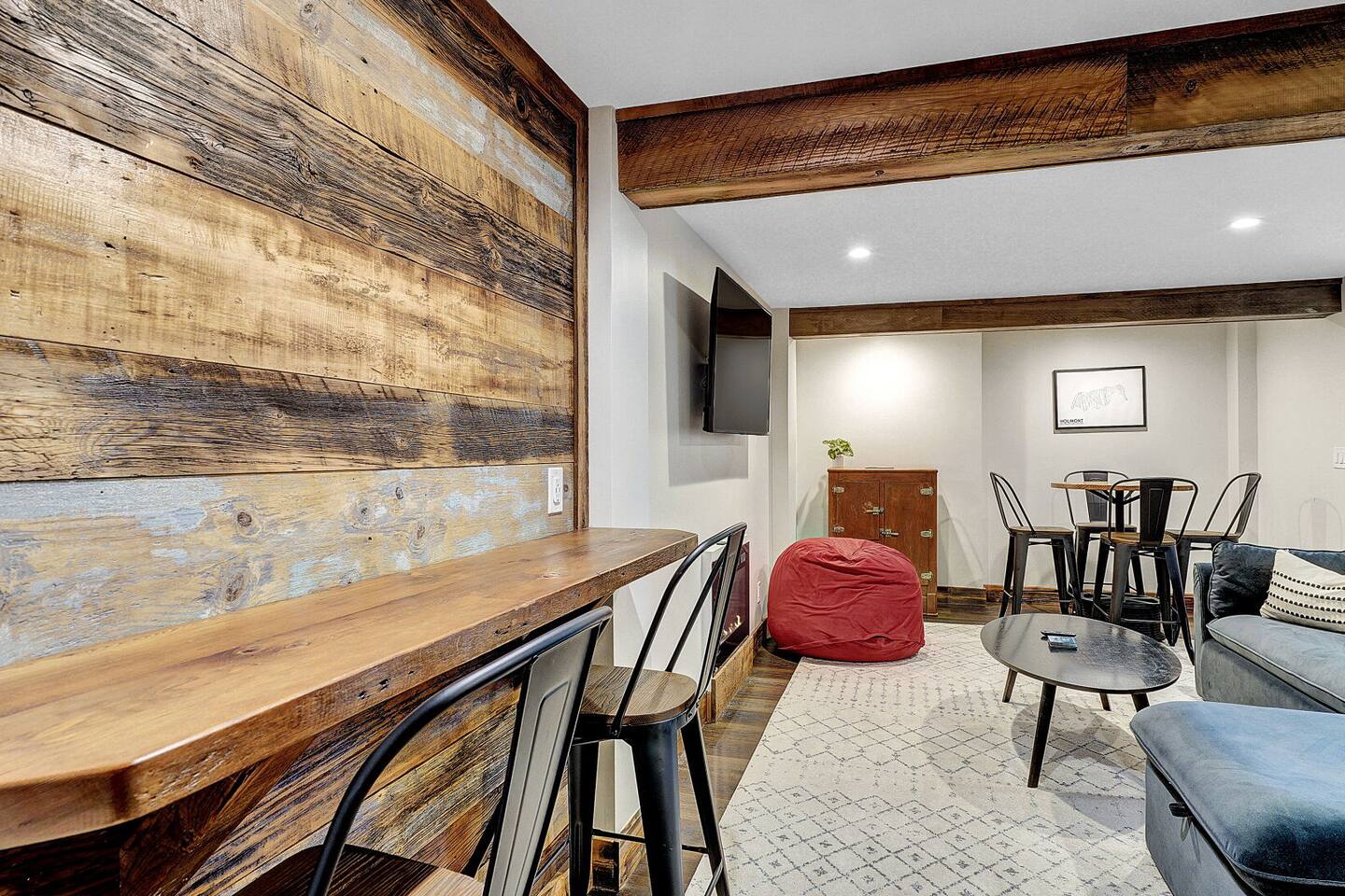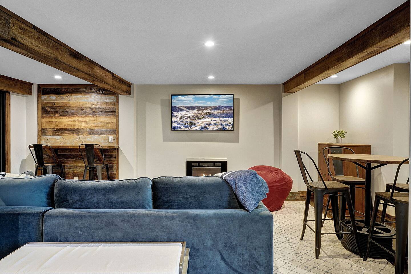 Renovated between 11/19-1/20 this home is one of the most modern units of the 64 at Fox Ridge. Currently there are two floors of updated space including a spacious living room with views of Holiday Valley that are only surpassed by those from the chair lifts! The galley kitchen is fully stocked with everything you need to cook meals for a crowd including a waffle maker for breakfast and a fondue set for apres ski. The wood treatment is from a local barn built circa 1840 and taken down by hand before being repurposed @ Valley View. The table top was custom made by a local craftsman and made of reclaimed White Oak along with the step to living room and loft. The loft railing was replaced with a support beam from the same barn. A variety of games, books and puzzles can be found in the media center and were curated to create engaging connections and create lifelong memories. When the day is done and everyone is exhausted the sleeping arrangements will be sure to please. The large master bedroom on the second floor enjoys plenty of soft natural light for a gentle morning wake up. You may not want to get out of the Thuma King Bed w/ Serta hybrid mattress and the softest sheets you’ve ever experienced. 42” smart TV recently installed! A large closet for extended stays and a handsome full bathroom is located in this room as well. A loft w/ a queen & armoire is located by walking through the master & overlooks living room. Don’t fret- the same Thuma/Serta combo is set up for a good nights rest here too. You’ll find a private bedroom off of the living room which has a triple bunk bed to sleep up to 5. The views from this bunk room are spectacular! The smart TV will have you binging on whatever your guilty pleasure is if the weather just isn’t cooperating. All the apps at your are fingertips including Disney+, Netflix, Showtime, Prime, HBO & Spectrum cable. But hey- get out and explore the Aspen of the East! Whether it’s a hike, a hamburger, a massage or a movie- our in house guide will ensure your experience in EVL is the best it can be! By the way, with a brand new high efficiency furnace and central air conditioning you'll be comfortable in a blizzard or a heat wave. The tank-less water heater will provide an endless supply of hot water so everybody can hit the shower then the town so fresh and so clean. Full basement with walk out doors and another beautiful view perfect for larger groups looking to have more space and more to do while inside. 55” smart TV and electronic dart board will provide hours of entertainment for adults and kids alike. The basement can sleep four with a full size memory foam sleeper sofa and full size Murphy Bed. There is a brand new full bathroom,Ski Locker with boot/glove dryer and large laundry room. Plenty of room to spread out in style and comfort around the electric fireplace.